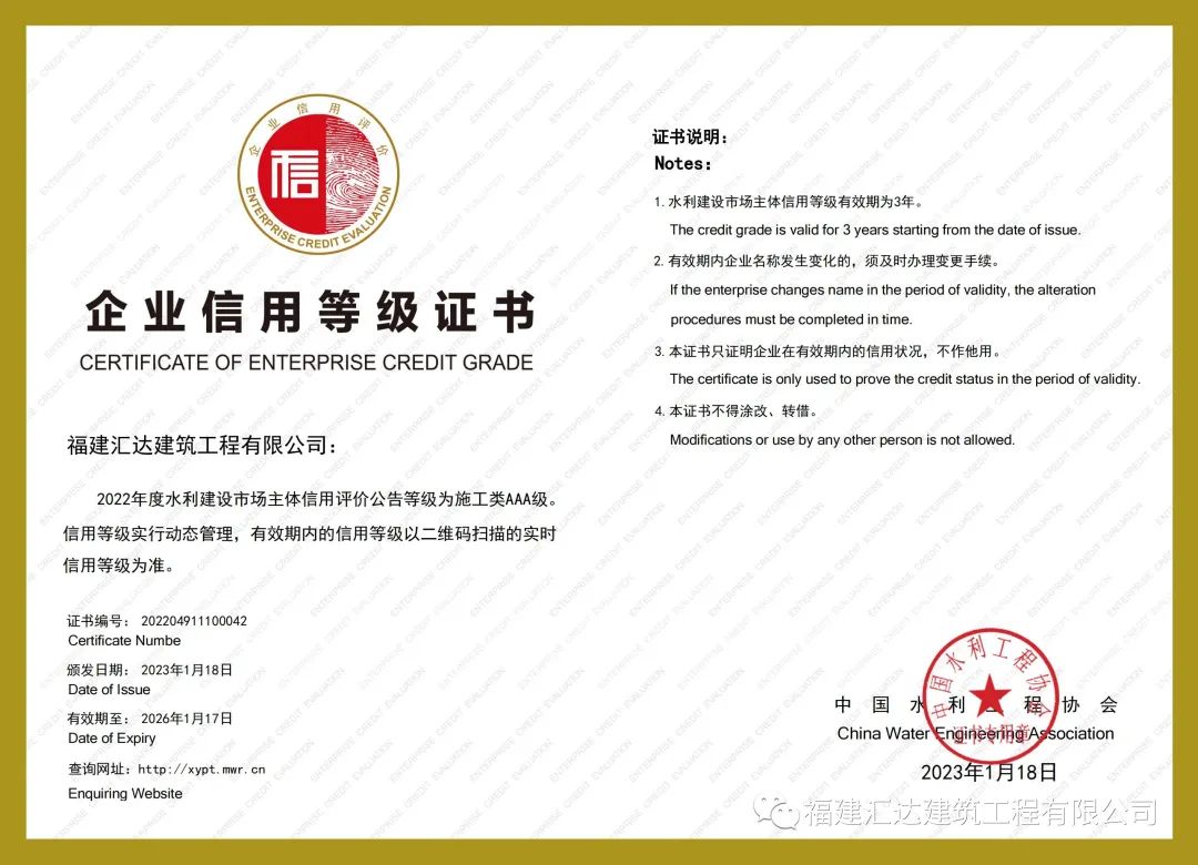 荣耀体育(中国)在2022年度水利建设市场主体信用评价公告等级为施工类AAA级